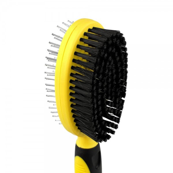 Двостороння масажна щітка для собак і котів. Щітка масажна необхідна для щоденного догляду за шерстю собак та котів. Цей інструмент має робочі поверхні з двох сторін. З одного боку гребінець масажер для розчісування шерсті, а з іншого боку щетиниста щітка для видалення з поверхні тіла тварини вичесаної шерсті. Ергономічна ручка виконана з протиковзного матеріалу. Цей інструмент при необхідності швидко приведе шерсть тварини в охайний зовнішній вигляд.